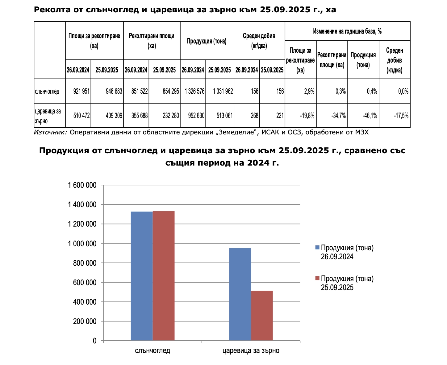 Реколта от слънчоглед и царевица за зърно към 25.09.2025 г., ха