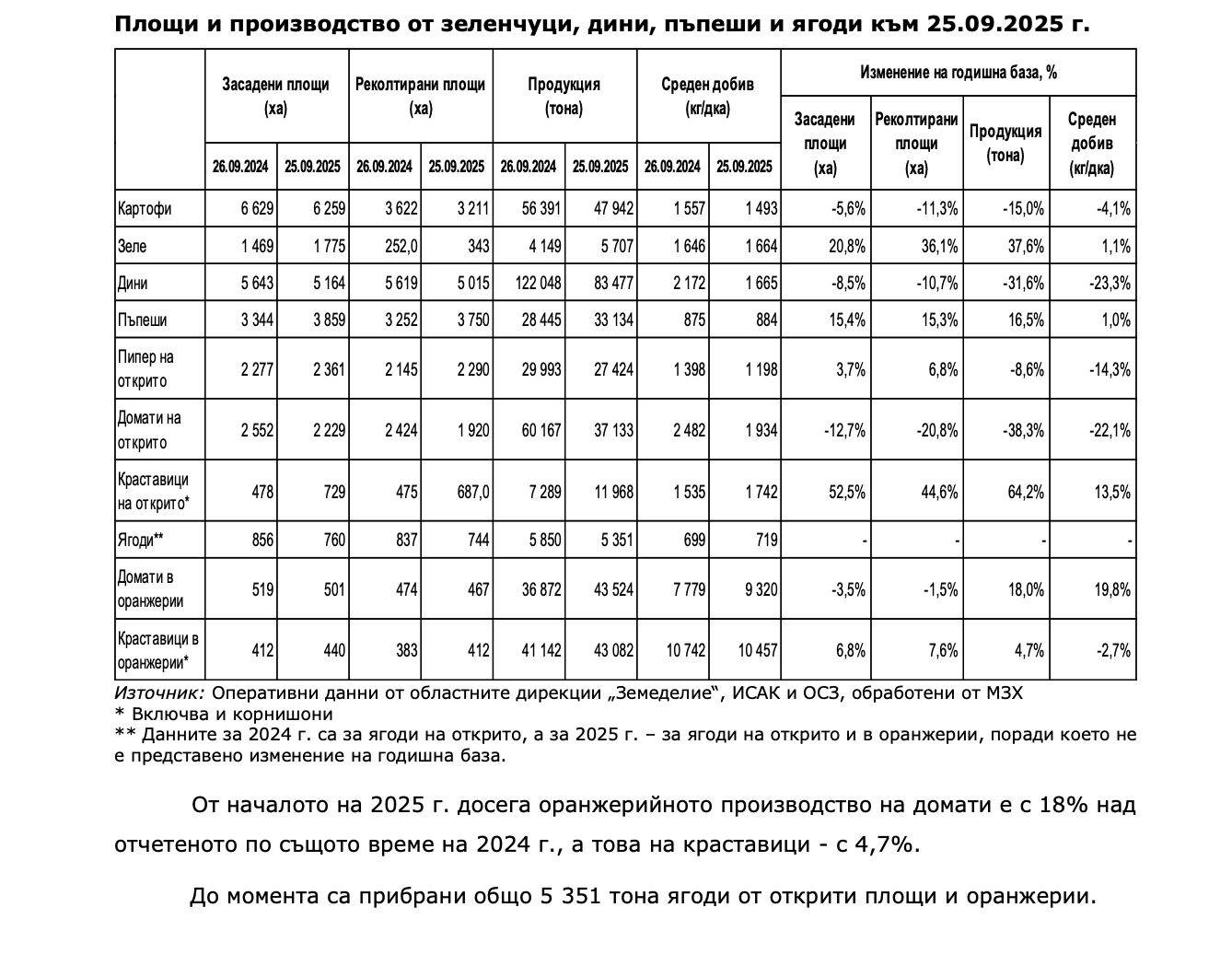 и зеленчуци по данни на Националния статистически институт, включена в Бюлетин