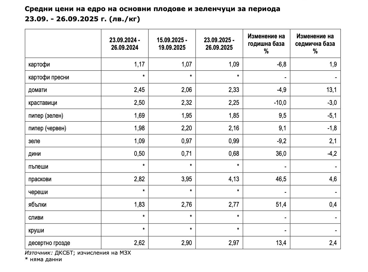 През периода 23 – 26 септември 2025 г. средните цени на едро на ябълки, картофи,